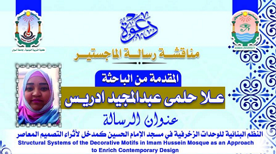 دعوة لحضور رسالة الماجستير المقدمة من الباحثة/علا حلمي عبدالمجيد – بقسم التربية الفنية بالكلية غداً الثلاثاء الموافق 14/1/2025 في تمام الساعة الثانية ظهراً بقاعة أ.د/ أحمد فوزي بكلية التربية.