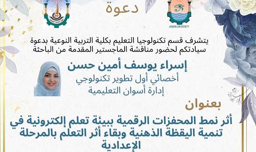دعوة لحضور مناقشة رسالة الماجستير بقسم تكنولوجيا التعليم للباحثه اسراء يوسف أمين – أخصائي أول تطوير تكنولوجي إدارة أسوان التعليمية – والتي جاءت تحت عنوان ” أثر نمط المحفزات الرقمية ببيئة تعلم الكترونية في تنمية اليقظة الذهنية وبقاء أثر التعلم بالمرحلة الإعدادية ” يوم الأربعاء الموافق 4/10/2023 في تمام الساعة الحادية عشر صباحاً، بقاعة أ.د/ أحمد فوزي.