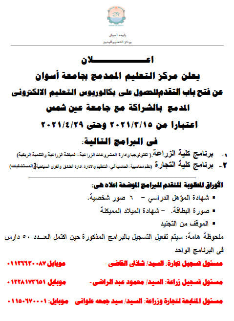 يعلن مركز التعليم المدمج بجامعة أسوان عن فتح باب التقديم للحصول علي بكالوريوس التعليم الاكتروني المدمج بالشراكة مع جامعة عين شمس لمزيد من التفاصيل يرجى الضغط على اعلان مركز التعليم المدمج