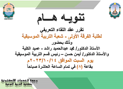 أمسية وطنية تحت شعار- في حب الوطن - شهدها الأستاذ الدكتور/ أحمد غلاب - رئيس الجامعة والسادة النواب والعمداء والقيادات الأمنية والعسكرية والتنفيذية والدينية بمحافظة أسوان، تضمنت تقديم كورال الكلية عدداً من المقطوعات الغنائية بقيادة الدكتور/ محمد راشد - رئيس قسم التربية الموسيقية .
