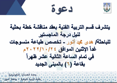 أن يصبح قسم التربية الفنية نموذجا للأقسام المبدعة في كلية التربية النوعية جامعة أسوان من خلال إرشاد الطلاب