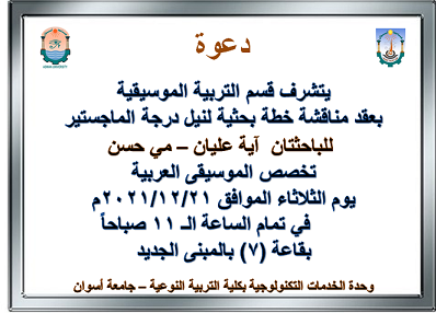 أمسية وطنية تحت شعار- في حب الوطن - شهدها الأستاذ الدكتور/ أحمد غلاب - رئيس الجامعة والسادة النواب والعمداء والقيادات الأمنية والعسكرية والتنفيذية والدينية بمحافظة أسوان، تضمنت تقديم كورال الكلية عدداً من المقطوعات الغنائية بقيادة الدكتور/ محمد راشد - رئيس قسم التربية الموسيقية .