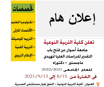 أن يصبح قسم التربية الفنية نموذجا للأقسام المبدعة في كلية التربية النوعية جامعة أسوان من خلال إرشاد الطلاب