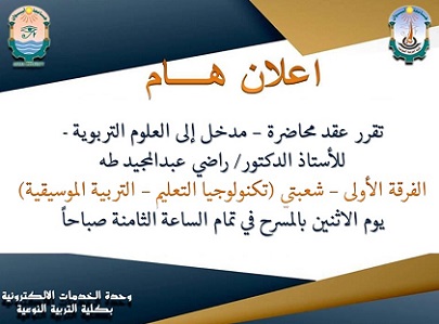 أمسية وطنية تحت شعار- في حب الوطن - شهدها الأستاذ الدكتور/ أحمد غلاب - رئيس الجامعة والسادة النواب والعمداء والقيادات الأمنية والعسكرية والتنفيذية والدينية بمحافظة أسوان، تضمنت تقديم كورال الكلية عدداً من المقطوعات الغنائية بقيادة الدكتور/ محمد راشد - رئيس قسم التربية الموسيقية .