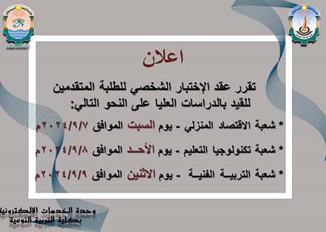 تحديد موعد الاختبار الشخصي للطلبة المتقدمين للقيد بالدراسات العليا