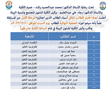تحت رعاية الأستاذ الدكتور/ محمد عبدالحميد راشد – عميد الكلية والأستاذ الدكتور/ رجاء علي عبدالعليم – وكيل الكلية لشئون المجتمع وتنمية البيئة، أعلنت لجنة اختيار الطالب المثالي أسماء الطلاب الذين اجتازوا المرحلة الأولى من المسابقة، علماً بأنه سيتم اجراء التصفية النهائية للطلاب يوم السبت الموافق 2022/12/10م ، بمكتب وكيل الكلية لشئون البيئة في تمام الساعة الثانية عشر ظهراً.