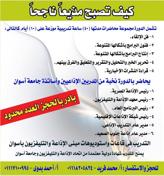 ينظّم المركز الإعلامي بالجامعة بالتعاون مع بين وزارة الإعلام ممثلة في الإذاعة المصرية دورة تدريبية لطلاب قسم الصحافة والإعلام التربوي بجامعة أسوان لتأهيلهم وإكسابهم خبرات سوق العمل، قيمة الاشتراك 1500 جنيه … لمزيد من التفاصيل يرجى الإطلاع على شروط الإشتراك