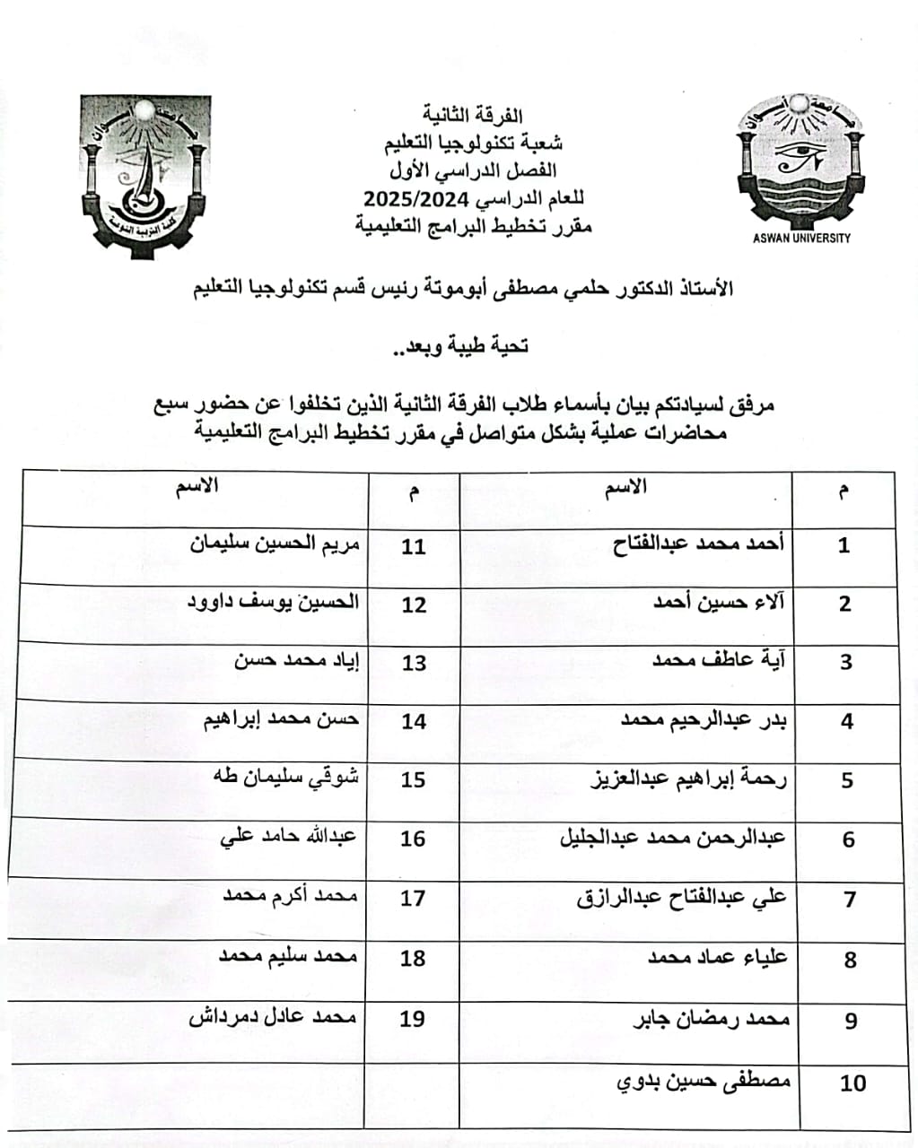 الفرقة الثانية – مقرر تخطيط البرامج التعليمية