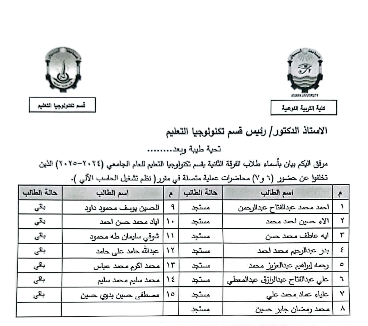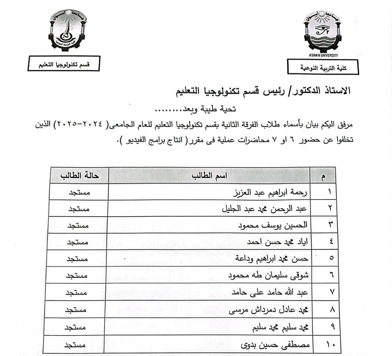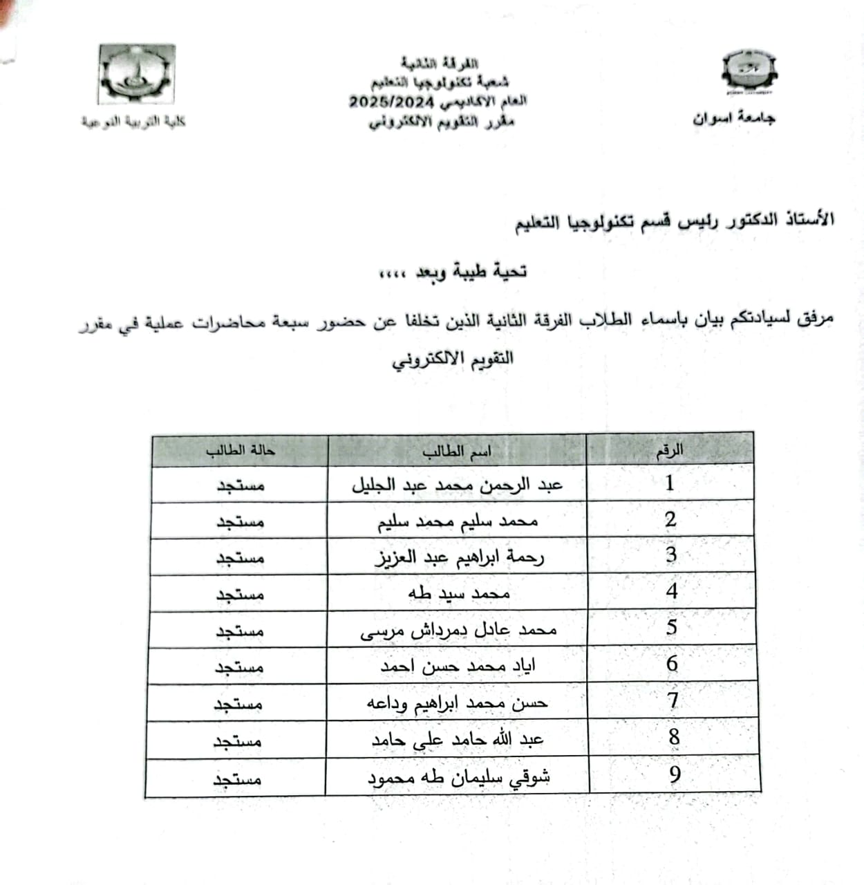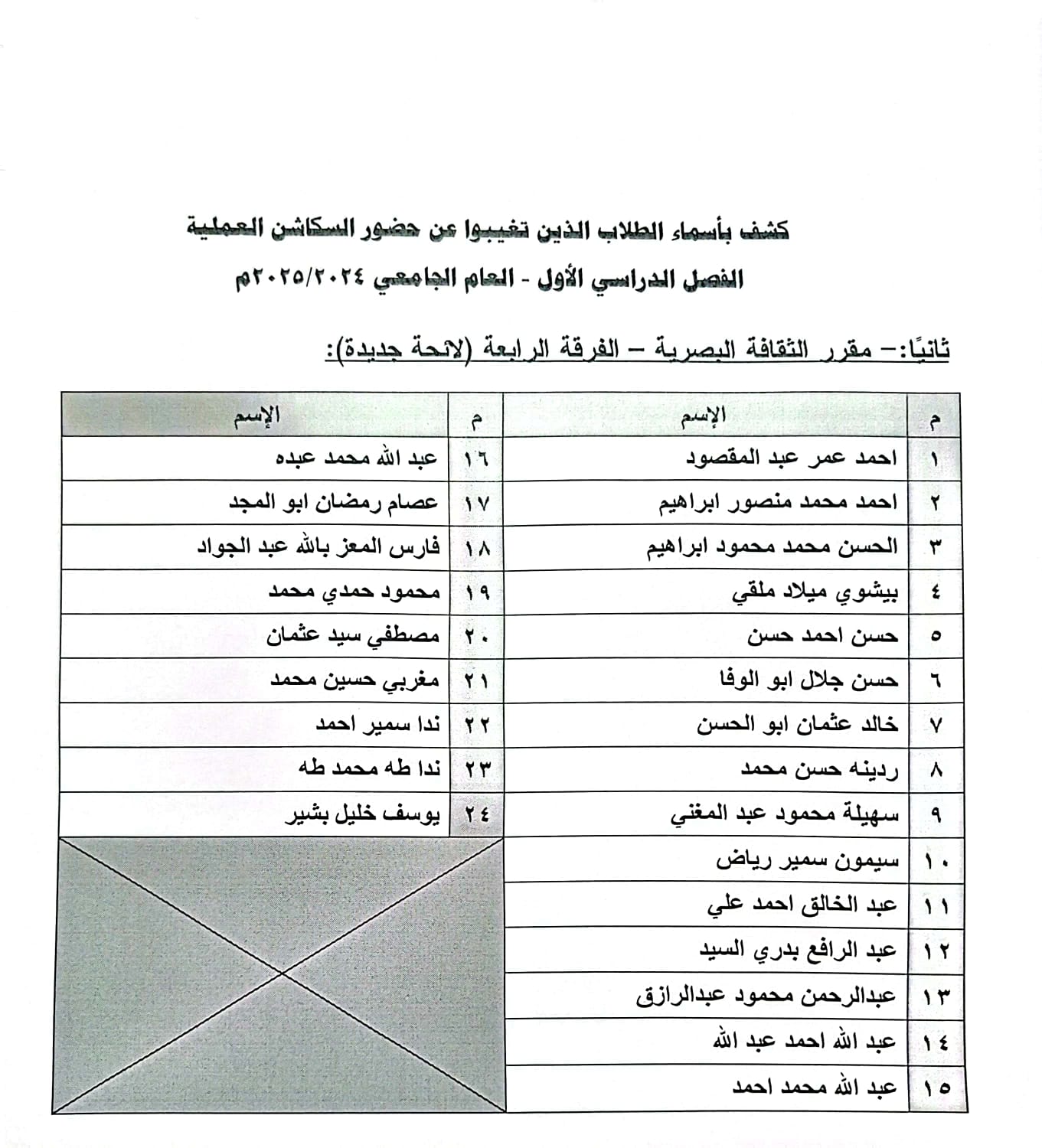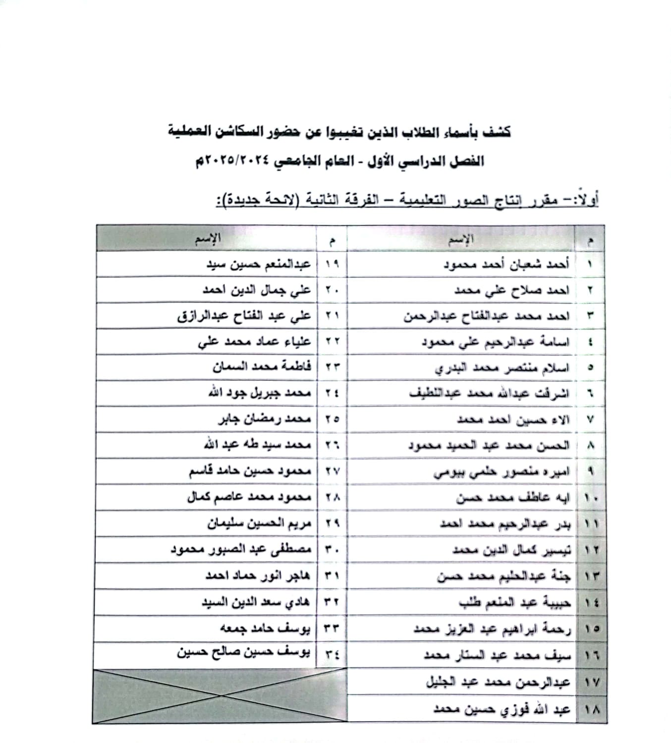 تم حرمان الطلاب التالي أسمائهم من دخول الامتحانات العملية وذلك نظراً لتجاوز المدة القانونية في الغياب عن المحاضرات.