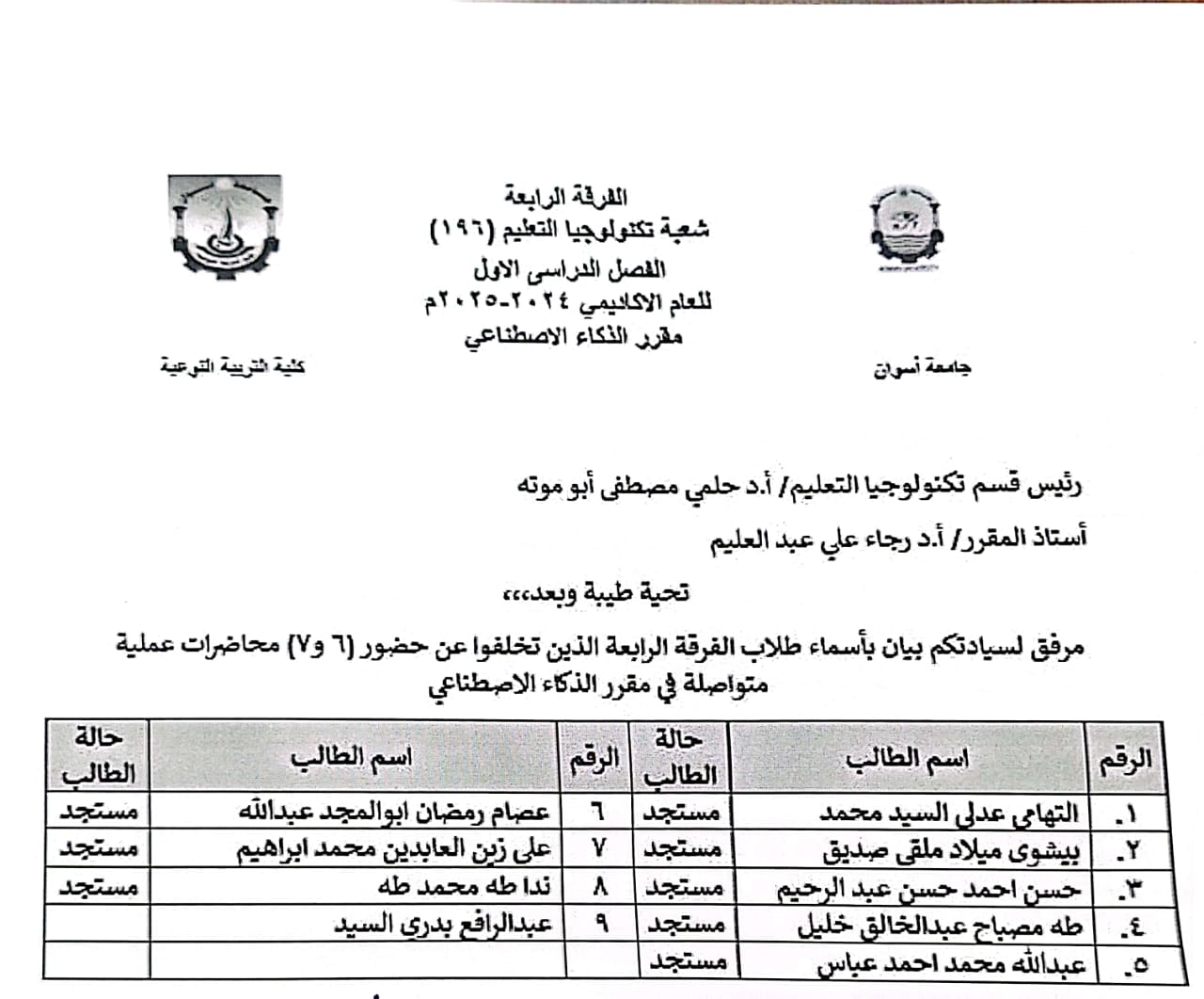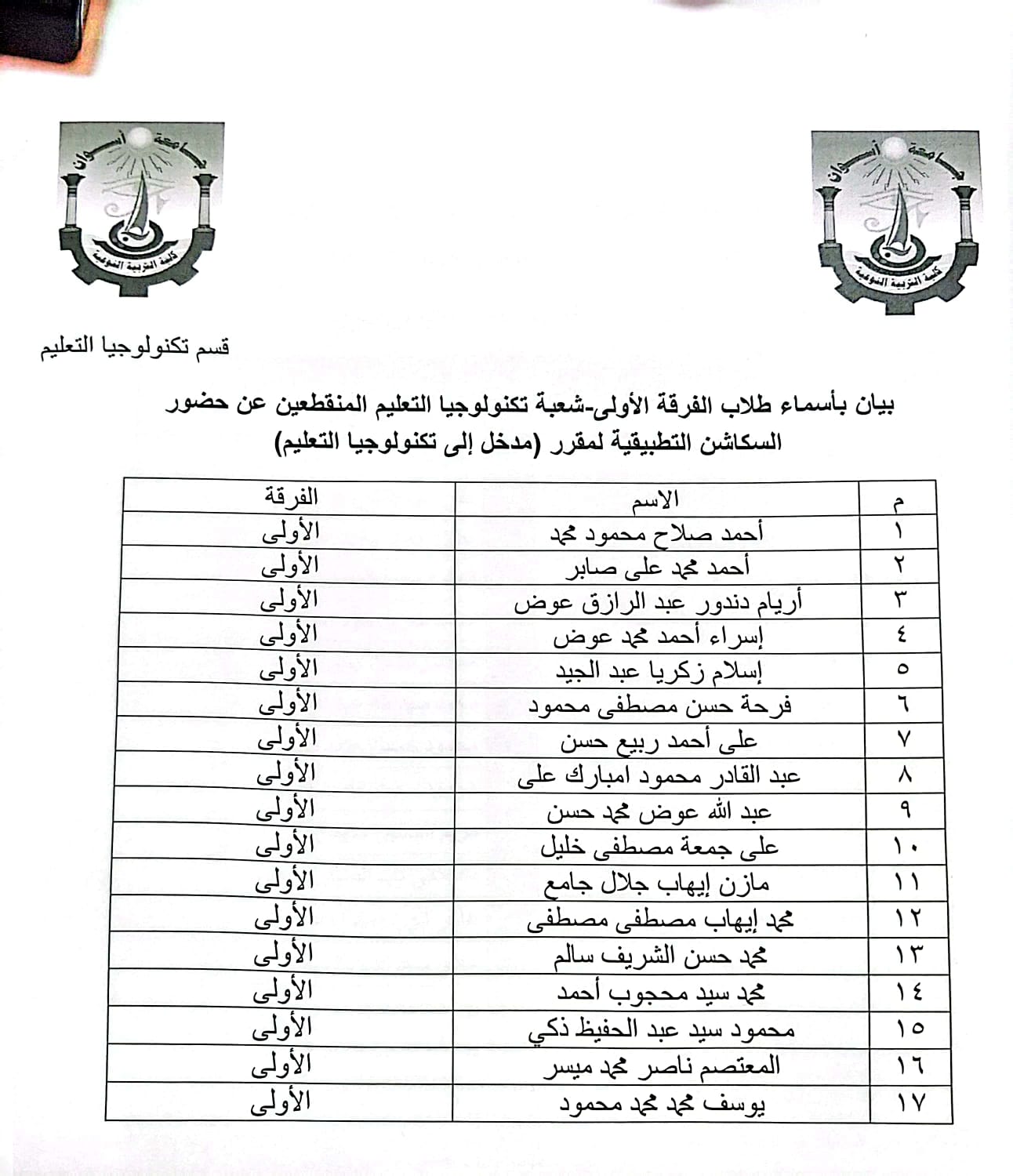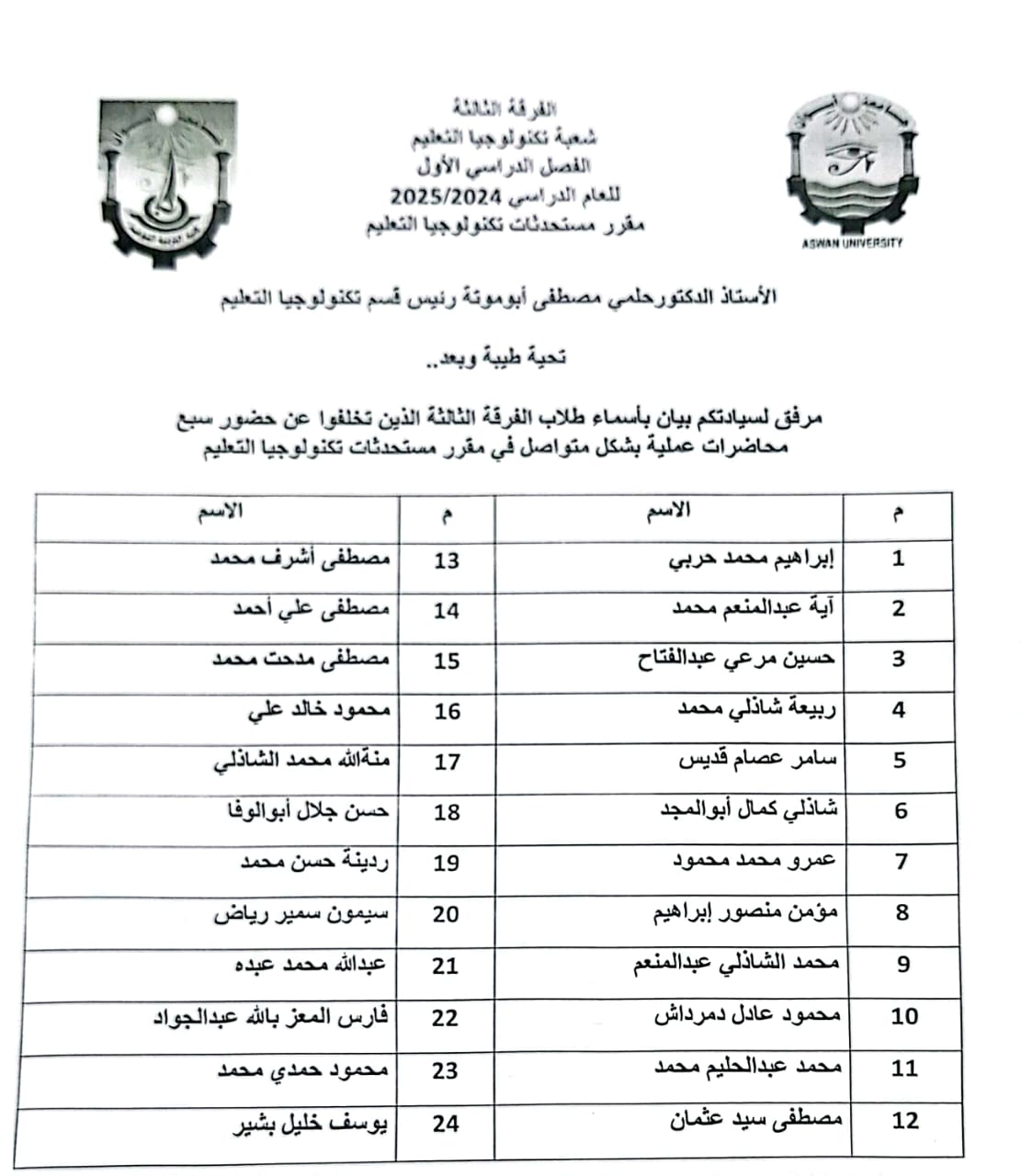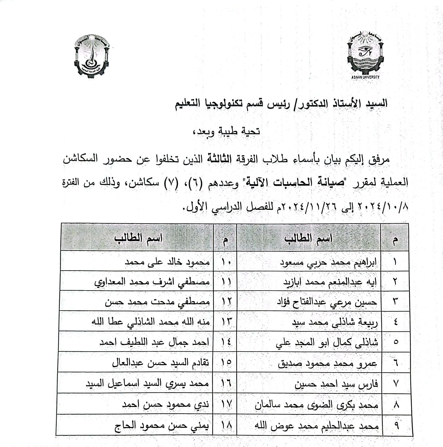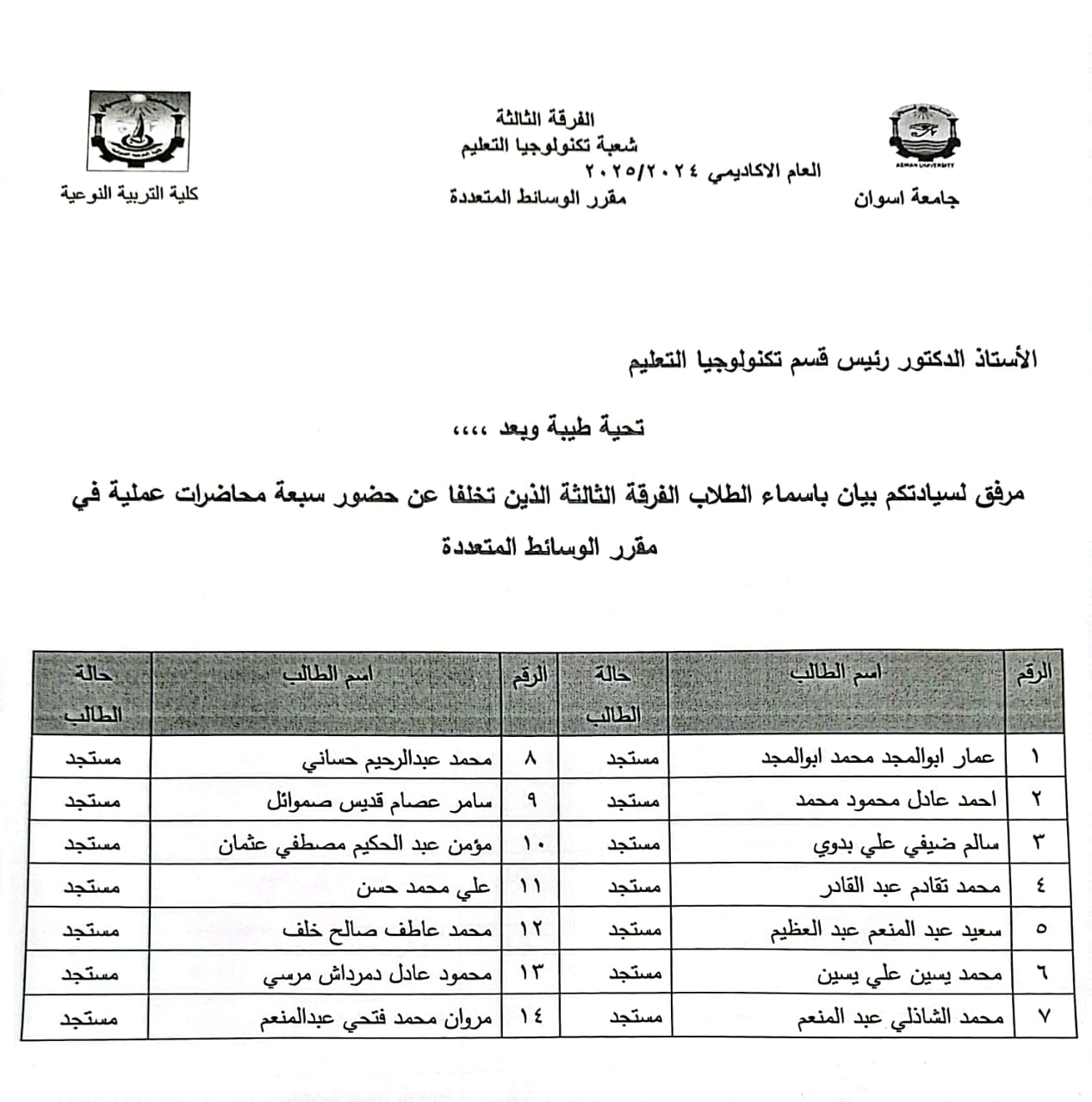 تم حرمان الطلاب التالي أسمائهم من دخول الامتحانات العملية وذلك نظراً لتجاوز المدة القانونية في الغياب عن المحاضرات.