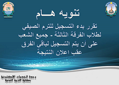 تقرر بدء التسجيل للترم الصيفي لطلاب الفرقة الثالثة فقط ،وتتم اجراءات التسجيل في ادارة شئون الطلاب بالكلية .