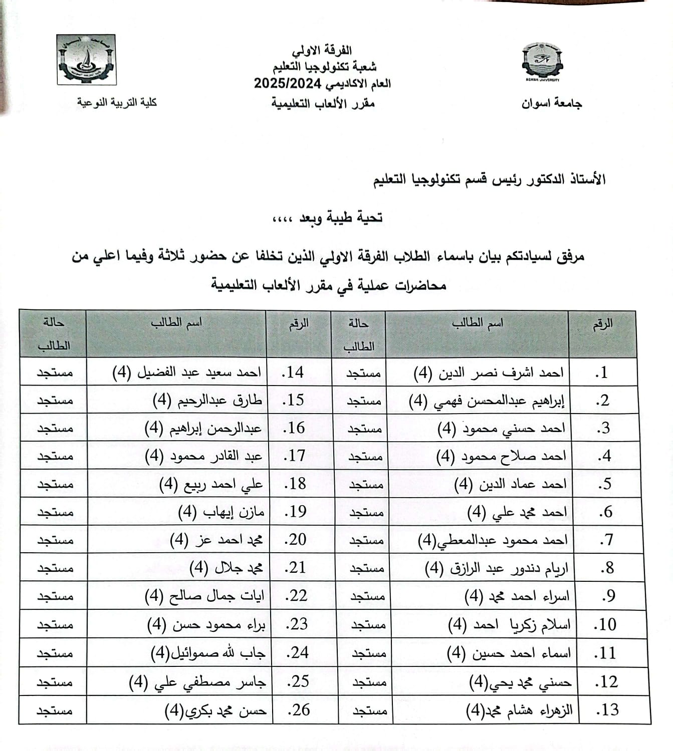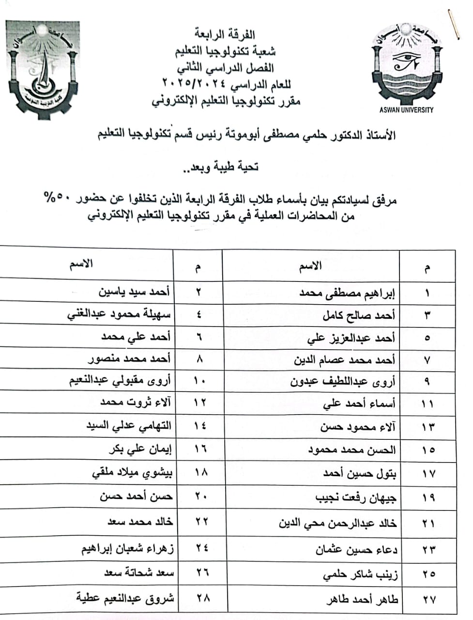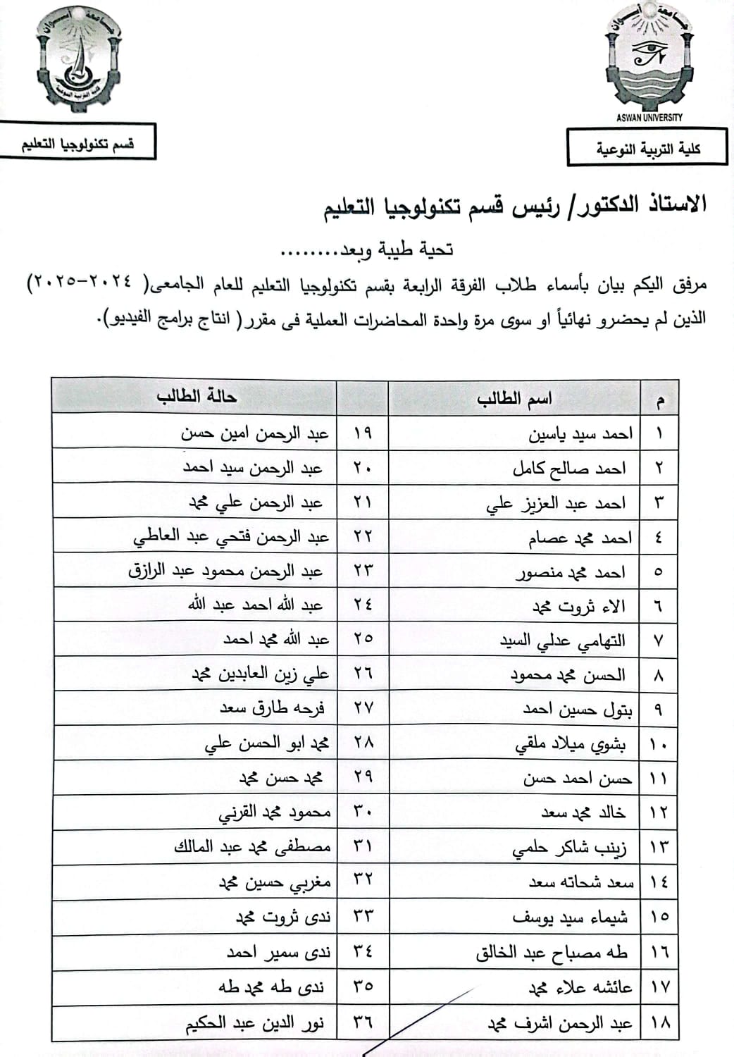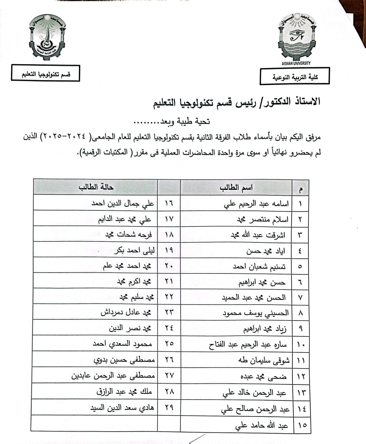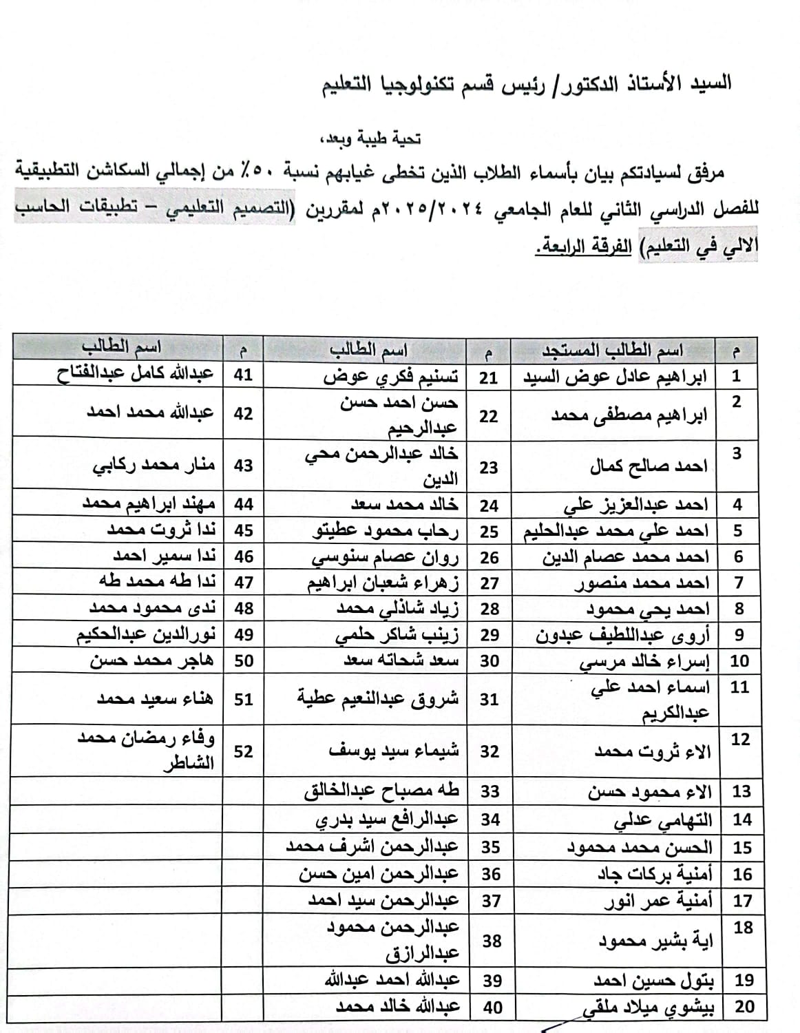 على الطلاب الآتي أسمائهم الالتزام بالحضور وتسليم التكليفات المطلوبة بقسم تكنولوجيا التعليم.. وذلك منعاً للتعرض للإجراءات القانونية التي قد تؤدي للحرمان من دخول الامتحانات.