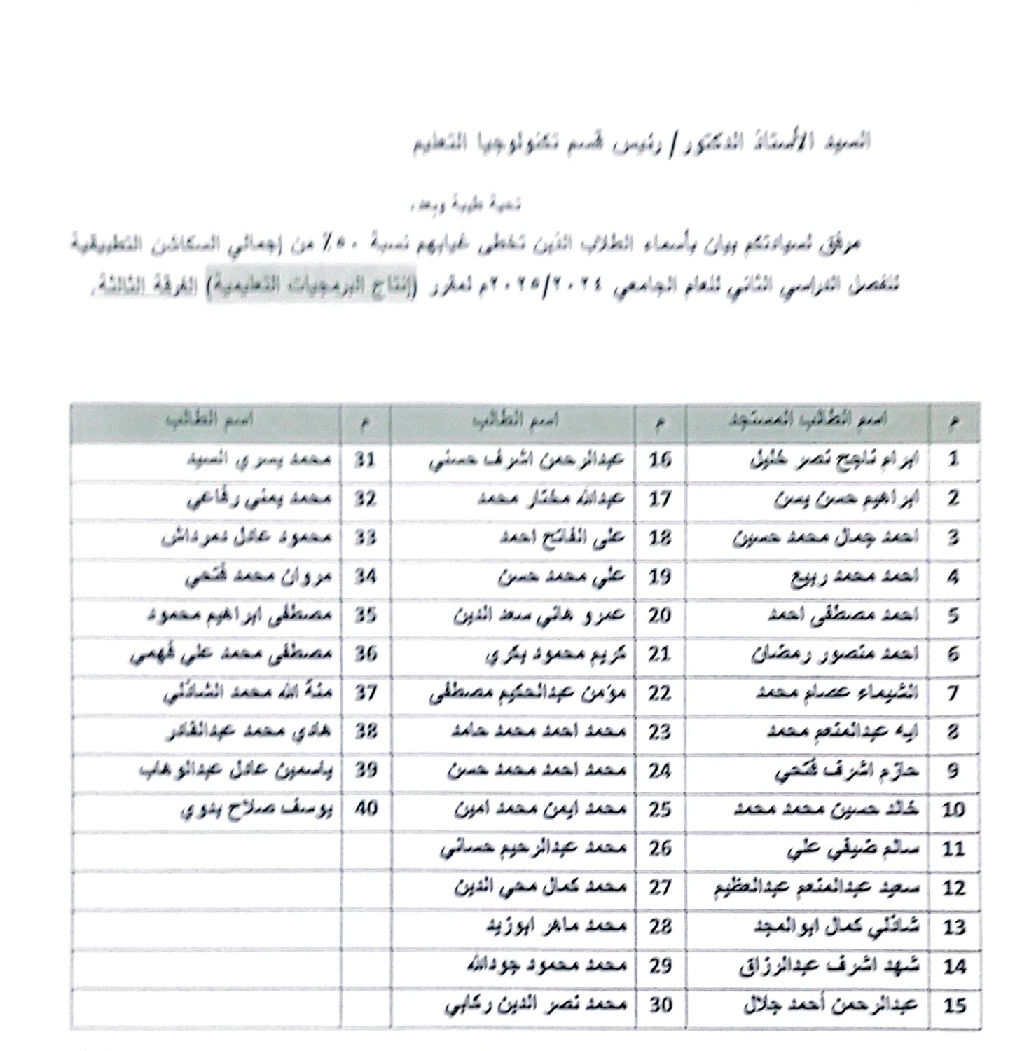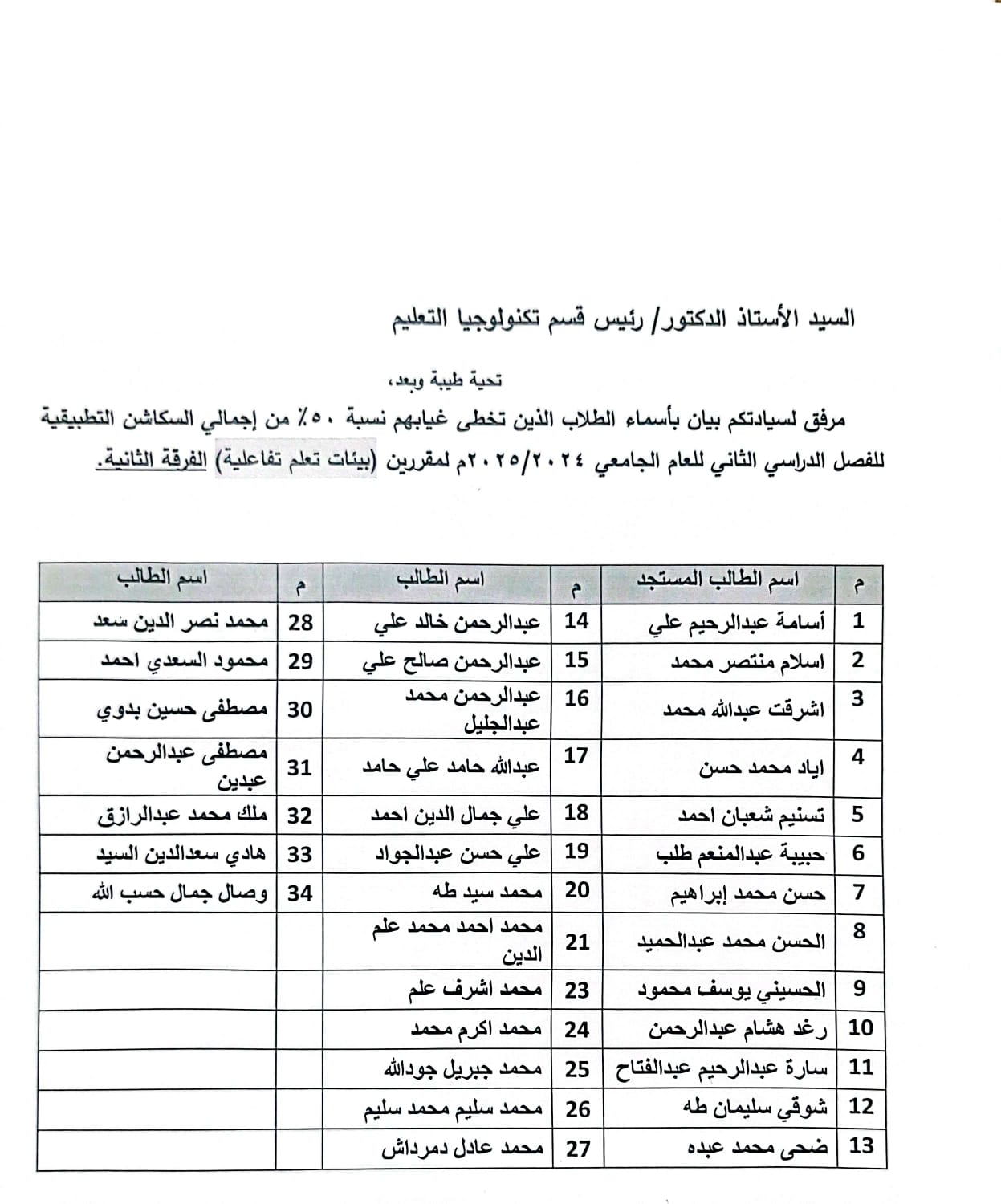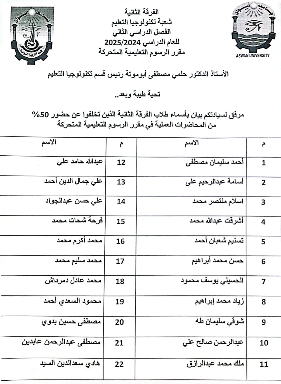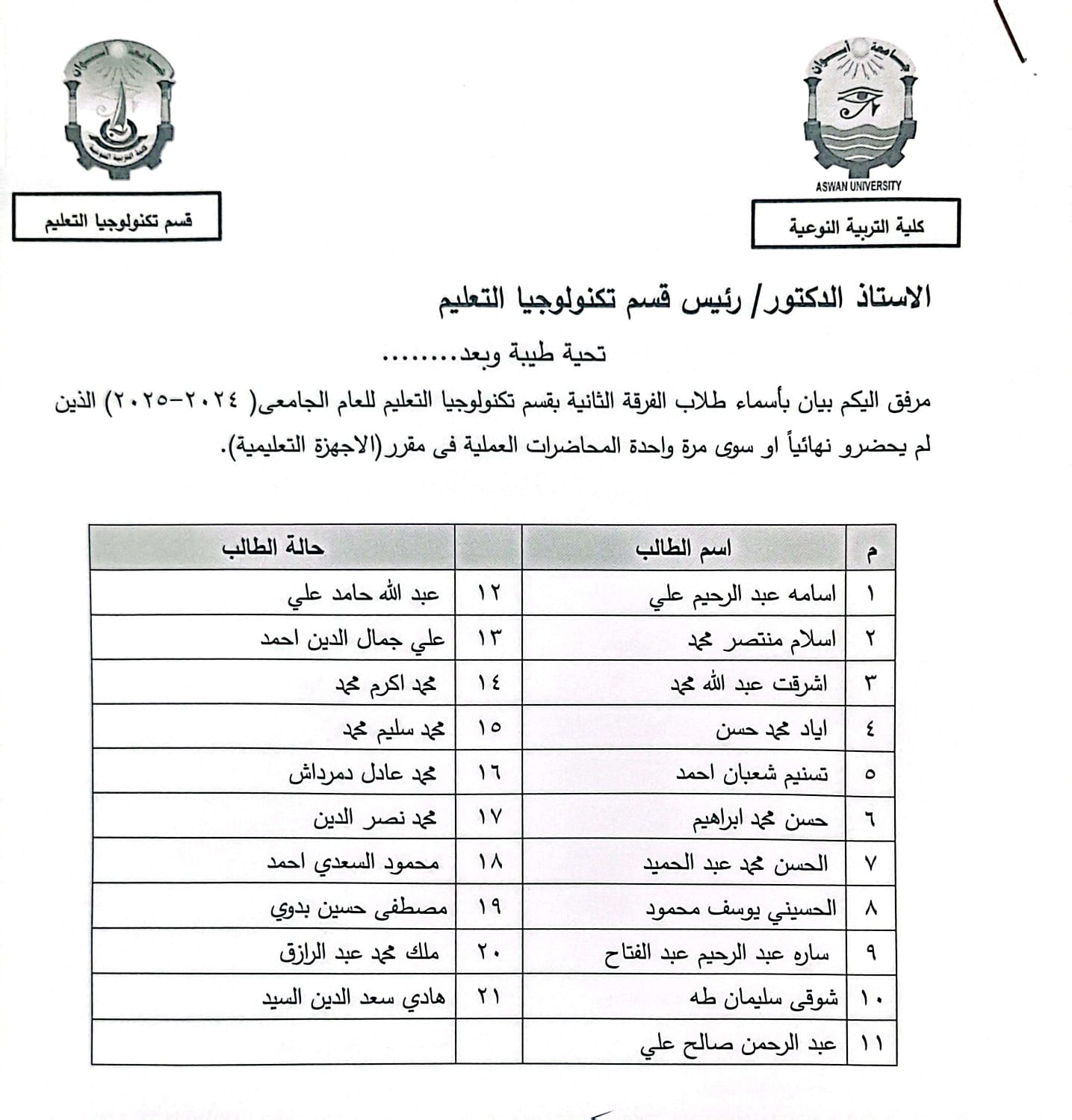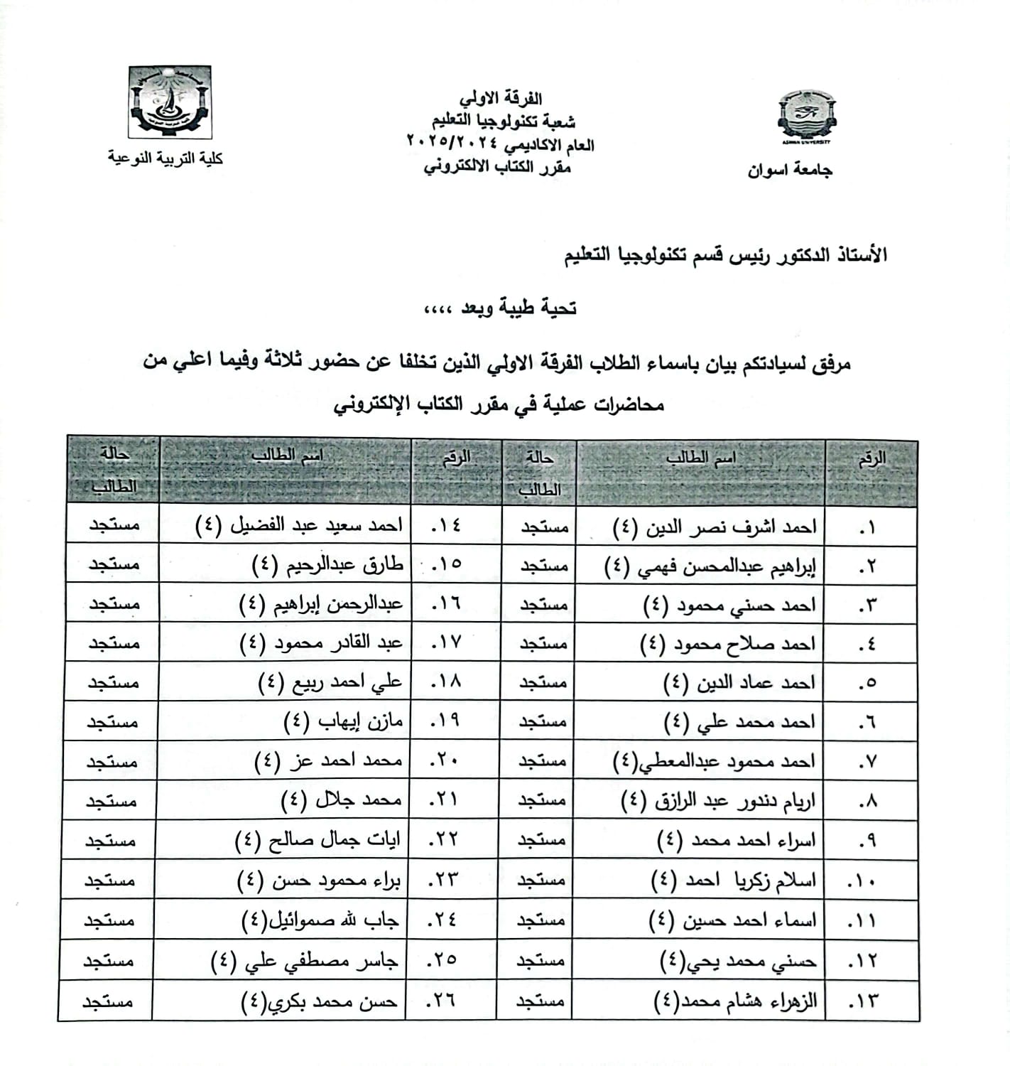 على الطلاب الآتي أسمائهم الالتزام بالحضور وتسليم التكليفات المطلوبة بقسم تكنولوجيا التعليم.. وذلك منعاً للتعرض للإجراءات القانونية التي قد تؤدي للحرمان من دخول الامتحانات.