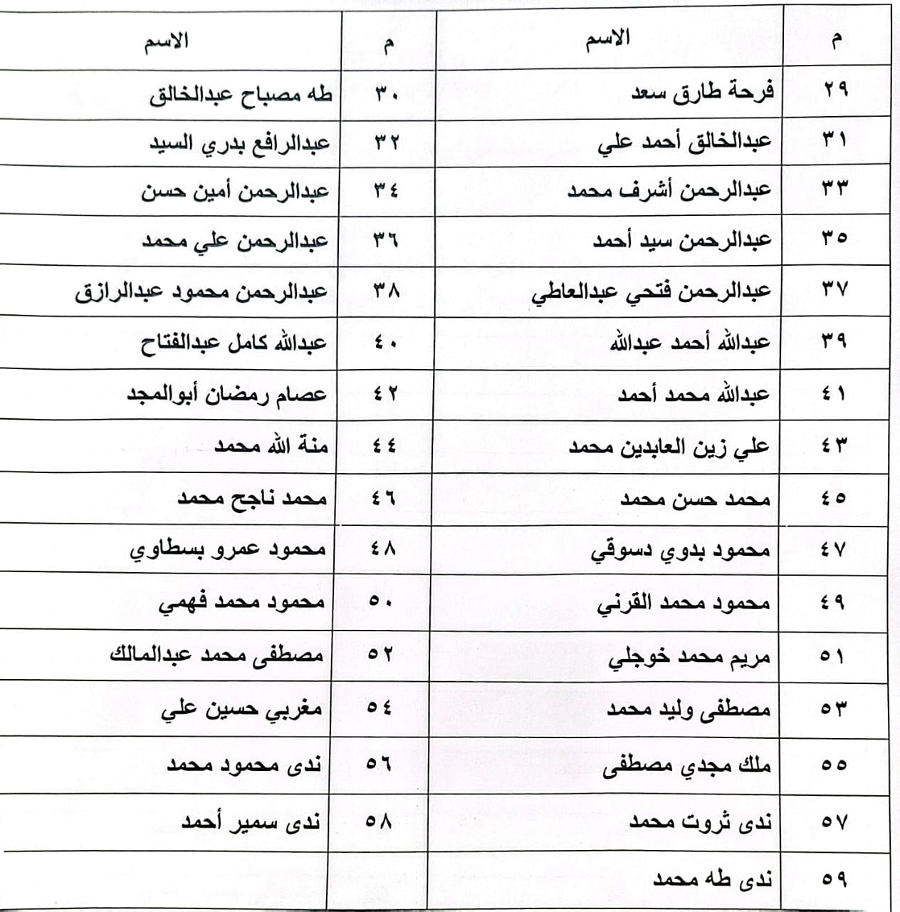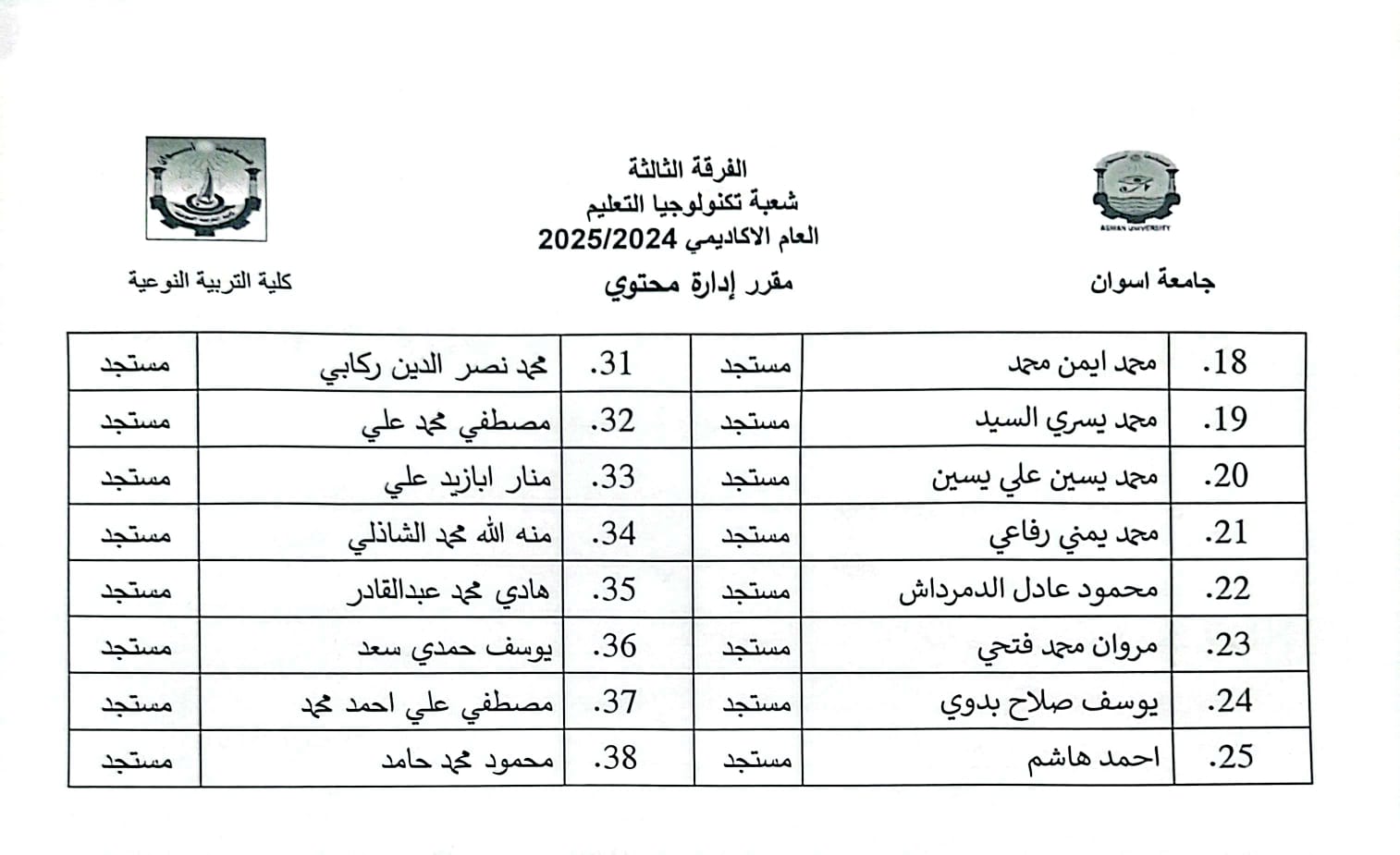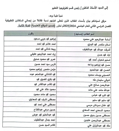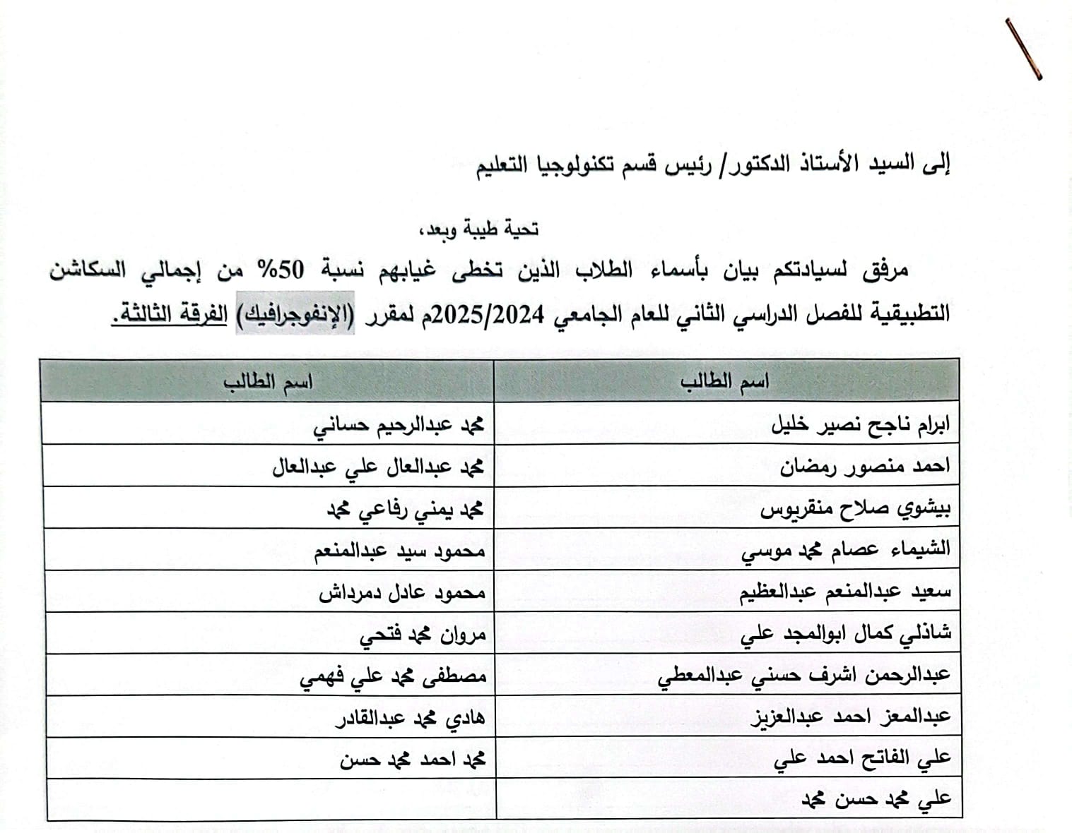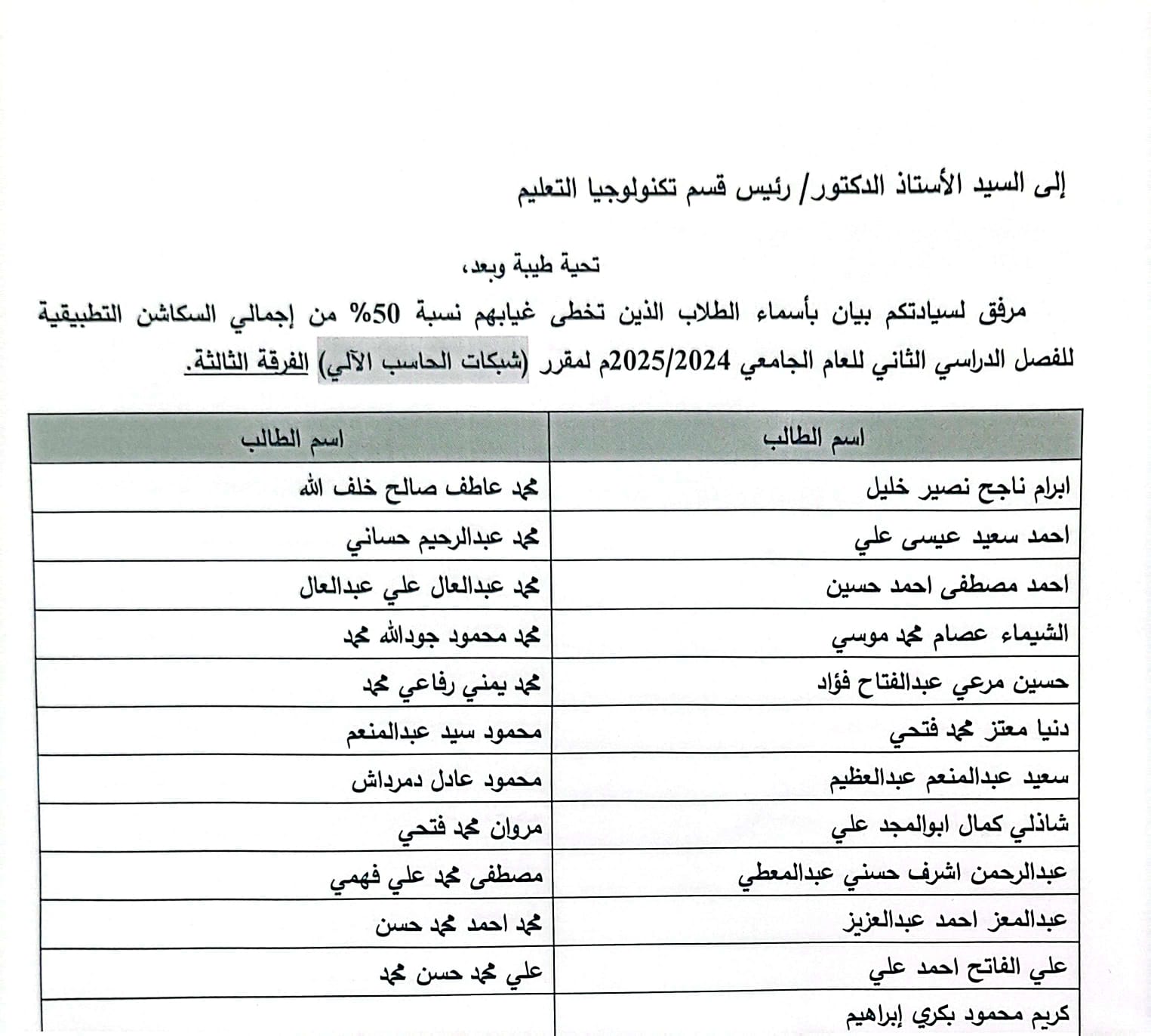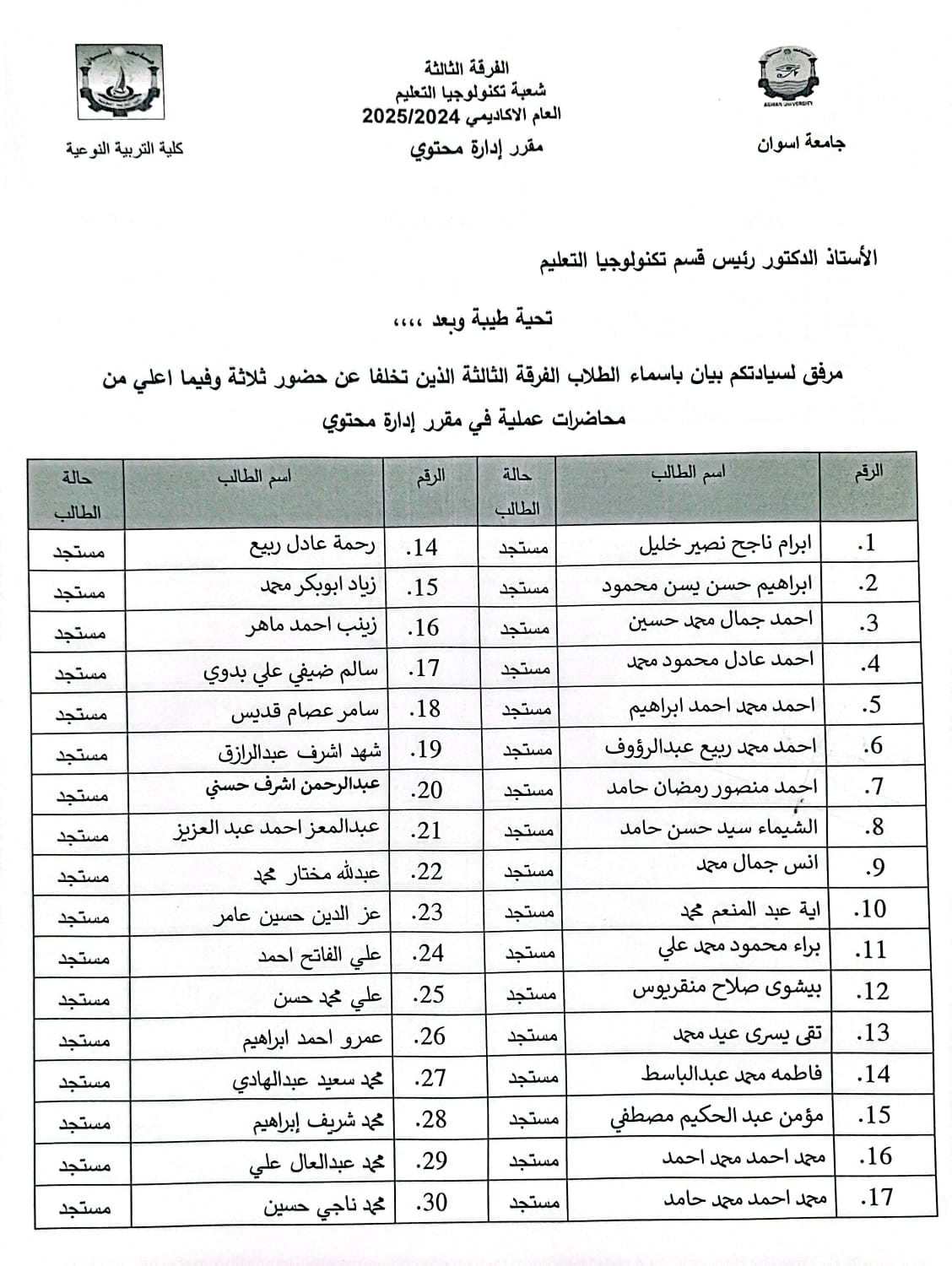 على الطلاب الآتي أسمائهم الالتزام بالحضور وتسليم التكليفات المطلوبة بقسم تكنولوجيا التعليم.. وذلك منعاً للتعرض للإجراءات القانونية التي قد تؤدي للحرمان من دخول الامتحانات.